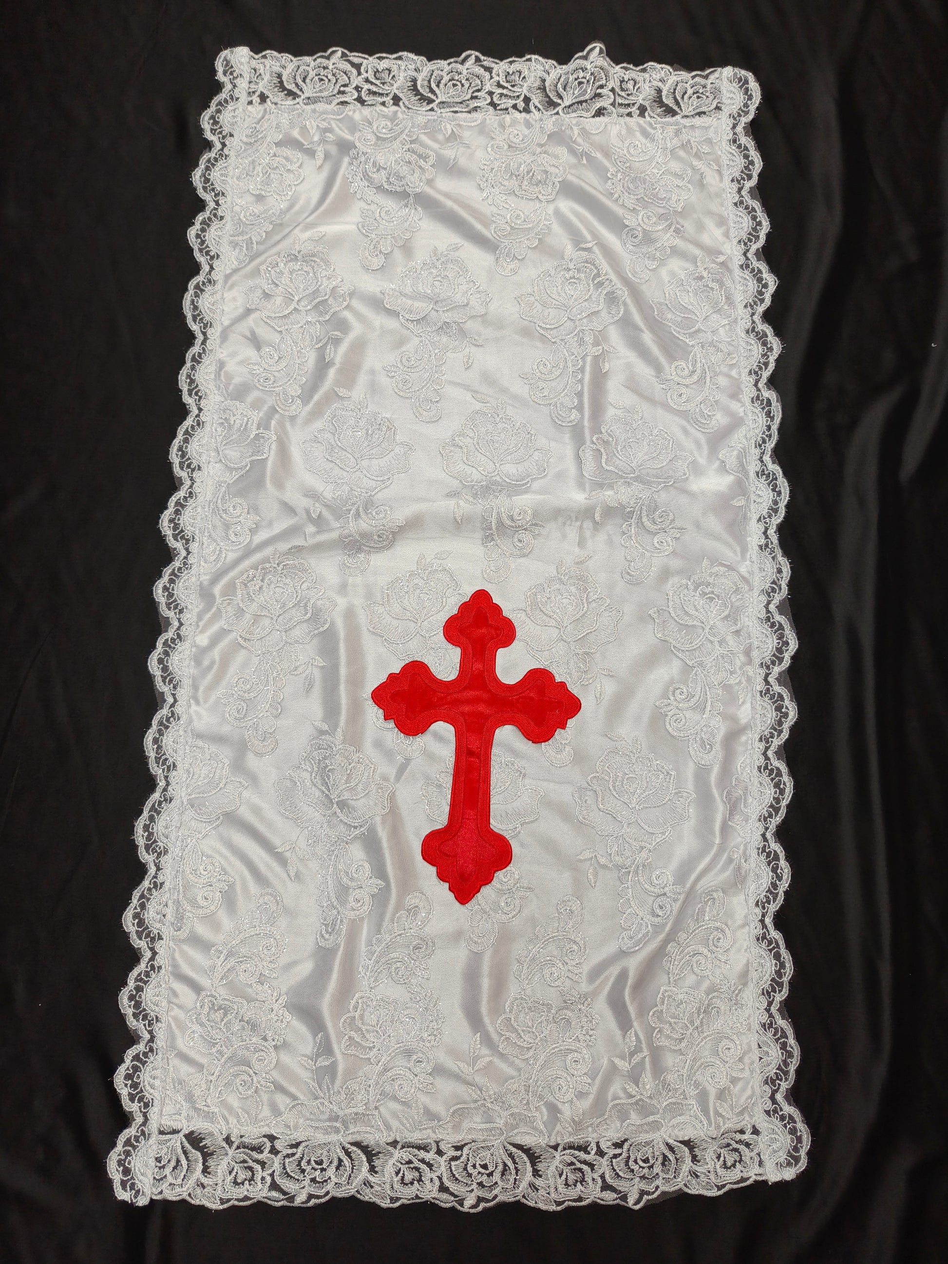 LACE PULPIT COVER (WHITE LACE & RED CROSS)